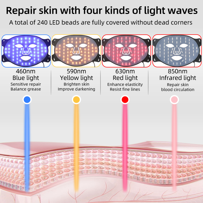 - Geel 590nm: Kalmeert de huid, vermindert roodheid en geeft een frisse, heldere teint.
